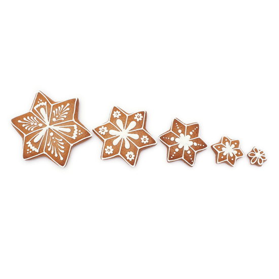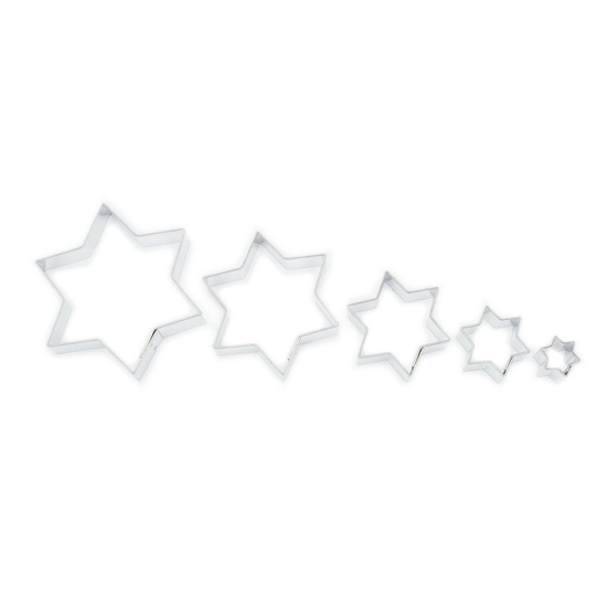 Sada pěti vykrajovátek cukroví v tvaru šesticípé hvězdy v různých rozměrech.