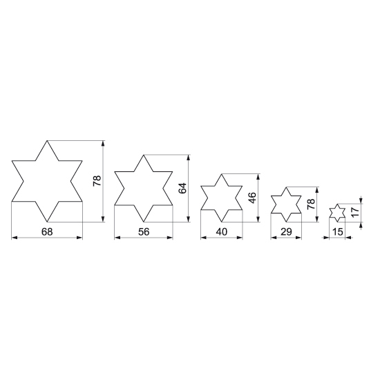 Vykrajovátka na cukroví ve tvaru šesticípé hvězdy s pěti různými rozměry (max. průměr 7,8cm). Jsou vyrobena z pocínovaného zdravotně nezávadného plechu. Výška pásku u všech vykrajovátek je 16 mm.