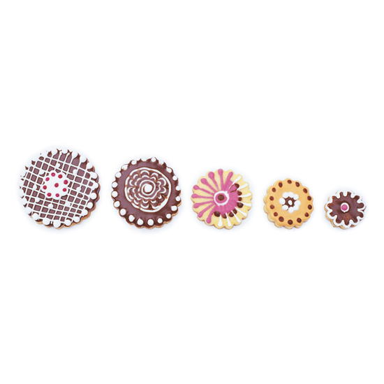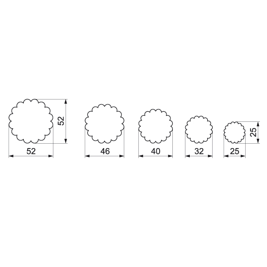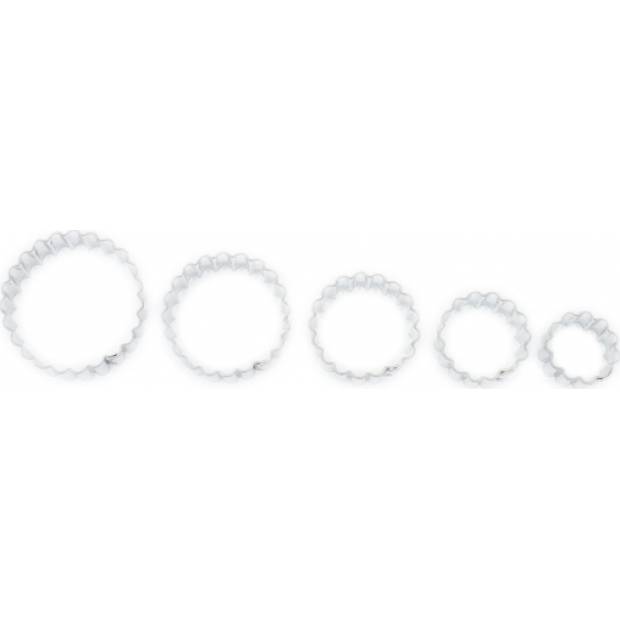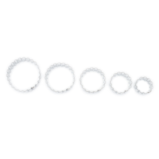Vykrajovátka s průměrem 5,2 - 4,5 - 4 - 3,2 a 2,5 cm mají tvar zubatého kolečka a můžete je použít na cukroví z perníkového, lineckého a dalších druhů těsta. Kvalitní pocínovaný a zdravotně nezávadný plech, z kterého jsou vyrobena, se velmi snadno umývá. Upečená kolečka můžete slepovat, ale i zdobit podle vaší fantazie s pomocí zdobících sad, které také najdete v naší nabídce. Pokud potřebujete pečící plech, na kterém se vám cukroví nepřipálí, máme ho samozřejmě také.