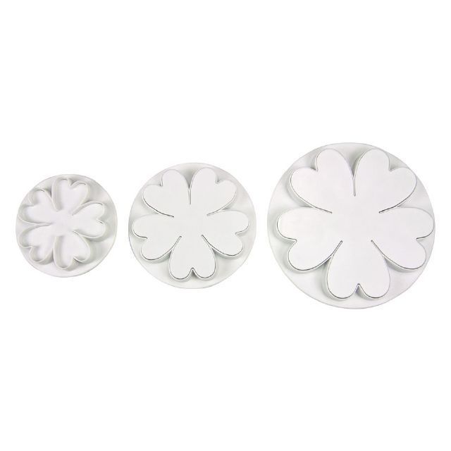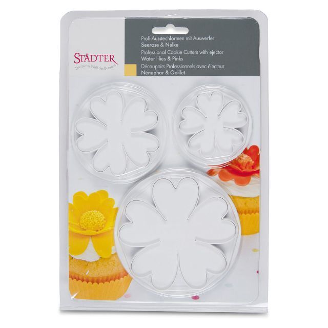 Sada 3 ks plastových pístových vykrajovátek ve tvaru květů leknínu/karafiátu . Zdobení dortů nebo zákusků je snadné. Vykrajovátko položíte na rozválenou hmotu, květ vykrojíte bez stlačení pístu - pouze přimáčknutím obvodu vykrajovátka. Vykrojený tvar zůstane uvnitř a pomocí pístu jej vymáčknete ven. Pomocí vykrajovátka můžete přímo zdobit dort - vykrajovátko s vykrojeným tvarem přiložíte na povrch dortu a jen stlačíte píst.