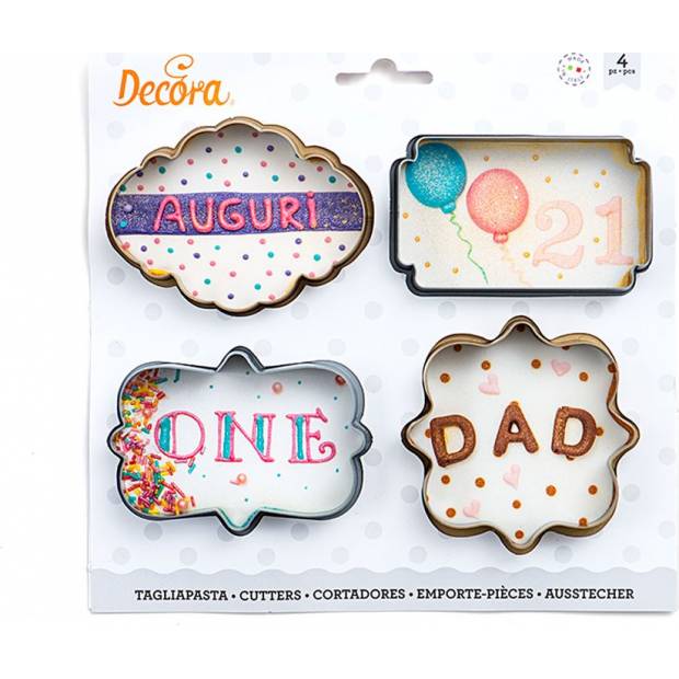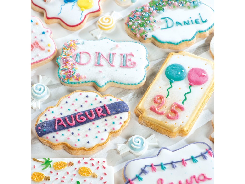Pomocí těchto vykrajovátek se čtyřmi tvary rámečku vytvořte luxusní sušenky pokryté královskou polevou. Inspirujte se při výrobě nejrůznějších sladkostí. Tyto vykrajovačky můžete použít i s cukrovou pastou, marcipánem. Rozměry 10 x 2 cm.