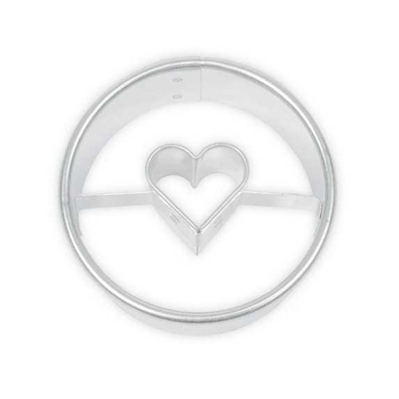 Vykrajovátko cukroví z různých druhů těsta v podobě kolečka se středem ve tvaru srdce. Na konečné ozdobení upečeného kolečka můžete použít různé cukrářské hmoty, krémy i jedlé zdobení, a také zdobící sady, které máme v nabídce samozřejmě také. Vykrajovátko je vyrobené ze zdravotně nezávadného pocínovaného plechu a velmi snadno se po použití umývá.