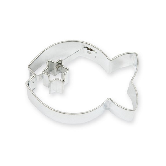 Vykrajovátko na cukroví z různých druhů těsta v podobě ryby s hvězdičkou. Na konečné ozdobení upečeného cukroví můžete použít různé cukrářské hmoty, krémy i jedlé zdobení, a také zdobící sady, které máme v naší nabídce. Vykrajovátko je vyrobené ze zdravotně nezávadného pocínovaného plechu a velmi snadno se po použití umývá.