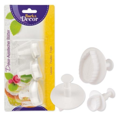 Vykrajovátko ve tvaru listu na fondant. Plastová vykrajovátka usnadní práci při tvorbě ozdob na dorty. Toto vykrajovátko je omyvatelné, v balení je 5 různých rozměrů. Můžete tak vytvářet menší či větší lístečky dle svého uvážení. Rozměry 105 x 57 x 220 mm / Cutter: 30 x 20 mm/ 35 x 24 mm / 45 x 30 mm.