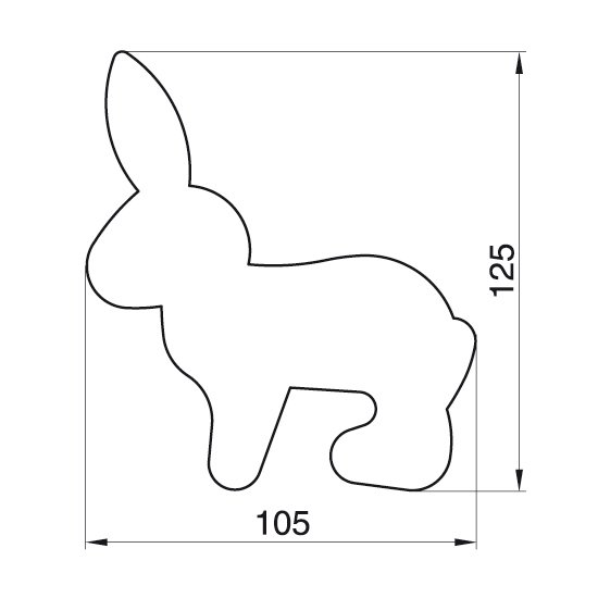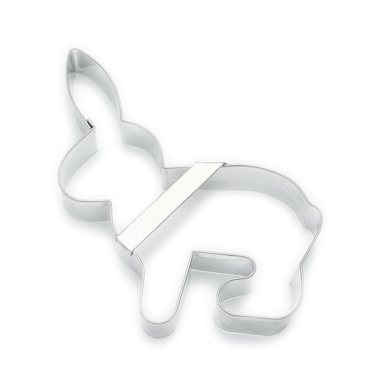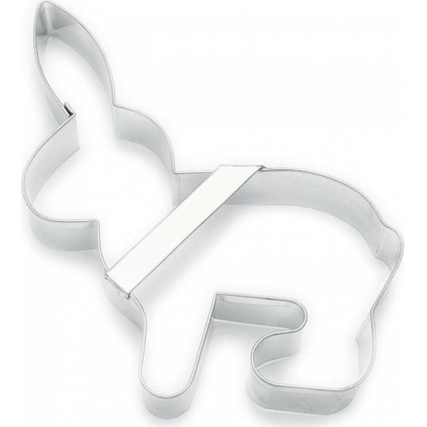 Vykrajovátko z pocínovaného plechu ve tvaru sedícího zajíčka má rozměr 10,5 x 12,5 cm.