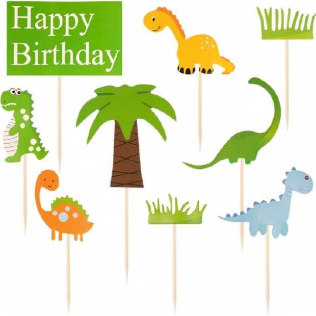 Sada devíti papírových topperů na dorty, na dřevěných špejlích, v narozeninovém aranžmá se zajímavým motivem. Zobrazuje pravěk a řeč je samozřejmě o Dinosaurech. Zápichy zobrazující různé druhy, včetně nápisu "Happy Birthday". Pozitivní, barevná kompozice, která nepochybně splní svou funkci na oslavě narozenin malého milovníka těchto prastarých tvorů. Navodí jedinečnou atmosféru a podtrhne tak význam příležitosti. Navíc přinese úsměv na dětské tváře.