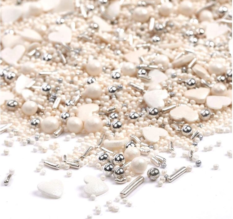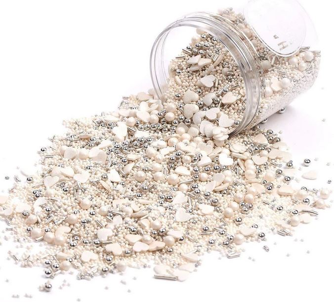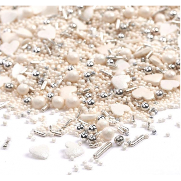 Slyšte zvonit svatební zvony - oblečené v bílém s kyticí květin, které se chystají projít uličkou…A žili šťastně až do smrti. Tato směs zdobení je ideální pro každou elegantní výzdobu svatebního dortu. Nicméně - ve skutečnosti se nemusíte vdávat, jen abyste je použili k přidání jiskry vašim pekařským výtvorům. Ať už jsou to koláče, koláče nebo sušenky - nebo možná máte jiný nápad, jak používat tyto krásné sypače? Možnosti jsou nekonečné. S bílými a stříbrnými cukrovými perlami, srdíčky a čokoládovými drtí - vaše kreativita nemá hranice.