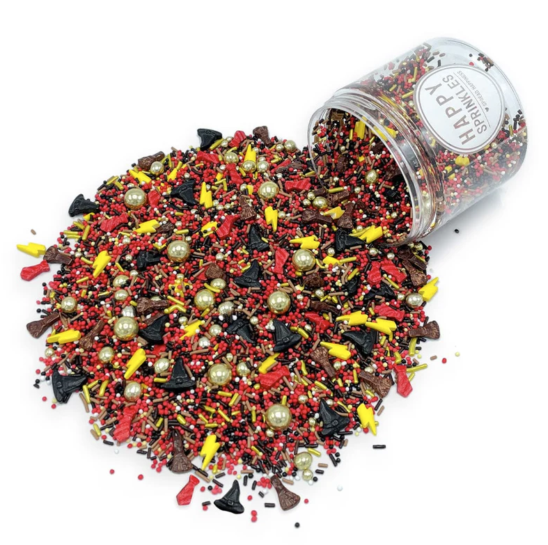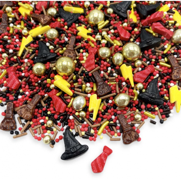 Plné barev a tvarů, najdete něco pro každou příležitost. Bez ohledu na to, zda se jedná o svatbu, dětskou narozeninovou oslavu nebo párty pro jakoukoli příležitost. Sypání vám vykouzlí úsměv mrknutím oka. Ponořte se do kouzelného světa magie s cukrovým zdobením World of Magic. Tato jedinečná směs vám umožní popustit uzdu fantazii a proměnit vaše upečené dobroty v pohádková mistrovská díla. Mix obsahuje žluté blesky, červené kravaty, černé kloboučky a roztomilá košťátka, všechny symboly tajemné školy magie. Vrcholem jsou zlaté čokoládové kuličky, které dodají vašim pamlskům nádech magie – ať už na cupcakes, dortech nebo sušenkách, tato směs je ideální pro vaši příští tematickou párty. Barva: černá, žlutá, hnědá, červená Kromě máčku, perliček a tyčinek obsahují posypy také tvary: blesk, klobouk, kravatu a koště. Ingredience: Cukr, škrob (PŠENIČNÝ, kukuřičný, rýžový), mouka (PŠENICE, PŠENICE, slad, rýže), PŠENIČNÁ MOUKA, rostlinné oleje (řepkový, kokosový), rostlinný tuk (palmový olej), glukózový sirup, MOUKA Z PLNOTUTNÉHO MLÉKA, kakao, kakao máslo, kakaová hmota, kakaový prášek, barviva (E100, E102*, E120, E129*, E133, E150a, E153, E160a, E172, E174), barviva (koncentrát černého rybízu, mrkev, ředkev, citronová šťáva), přírodní vanilkové aroma, leštící látky (E901, E903, E904), zahušťovadla (E406, E414, E460, E464), emulgátor (lecitiny (slunečnicový, řepkový, SÓJOVÝ), E472a, E473), želatina (hovězí), sůl. Může obsahovat stopy VNĚJŠÍCH OŘECHŮ. *E102, E129: Může mít nepříznivý vliv na aktivitu a pozornost dětí.