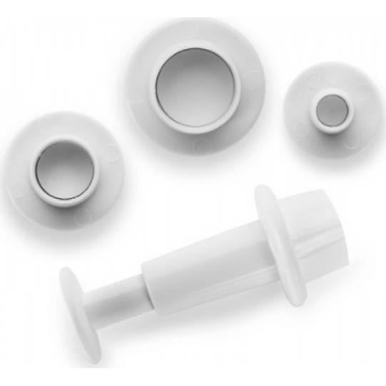 Komplet tří vykrajovacích šablonek s vytlačovacím nástavcem. Ideální pro rychlé a přesné vykrajování koleček a kroužků z fondánu, marcipánu nebo podobné dekorační hmoty. Vyrobeno z odolného plastu a velmi snadno omyvatelné.