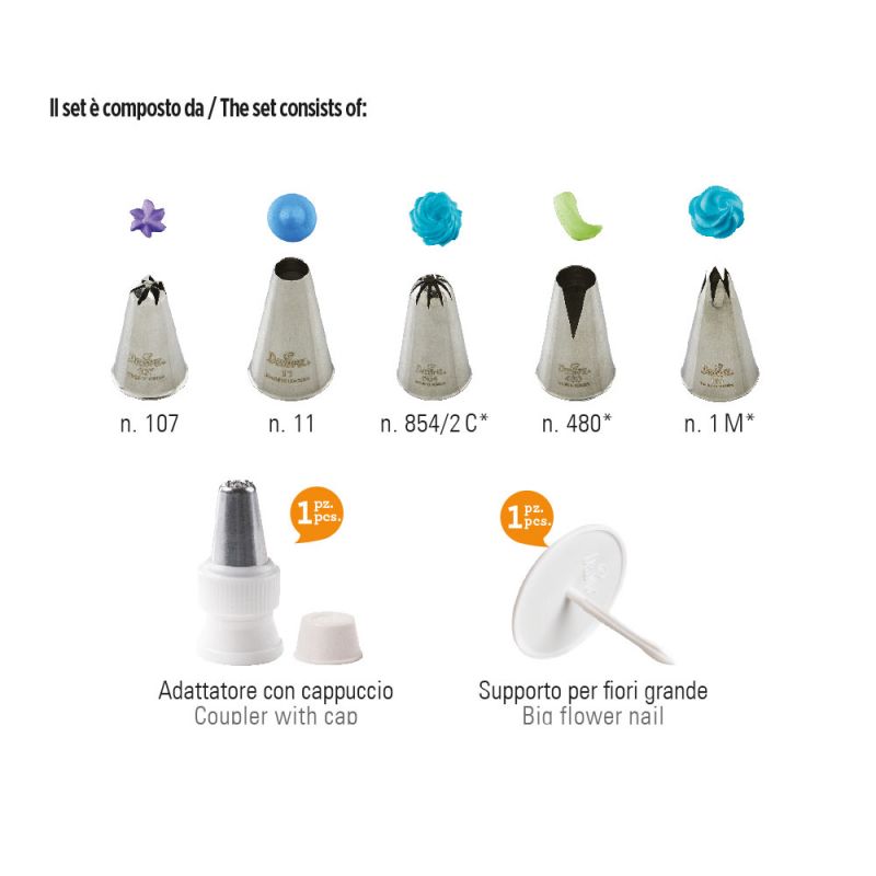 Sada standardních trezírovacích špiček ideální pro výrobu široké škály cukrářských dekorací. Sada obsahuje: 1 adaptér s maticí, 1 velký stojan na květiny, pažby číslo 107, 11, 854/2C*, 480*, 1M*. *Používejte bez adaptéru.