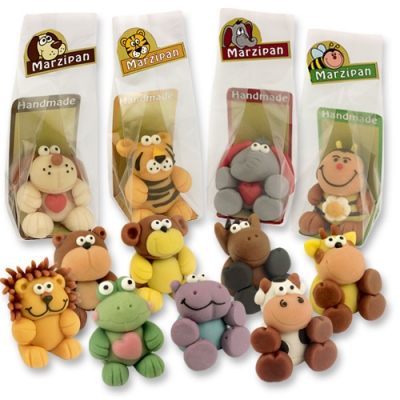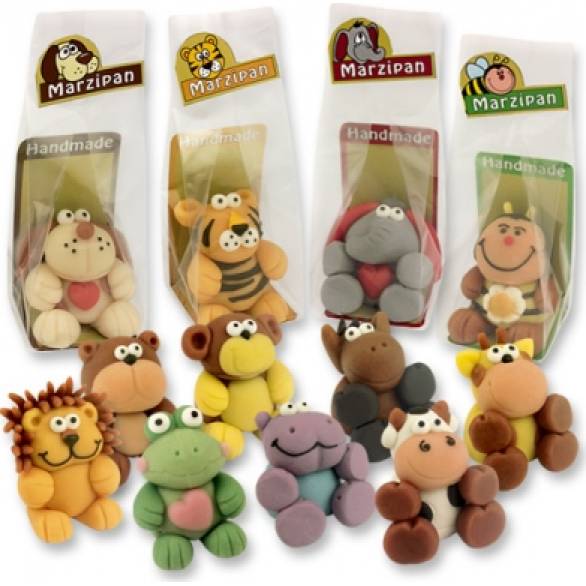 Marcipánové figurky v podobě zvířátek potěší malé i velké milovníky marcipánu. Tato jedlá dekorace je milým dárkem pro vaše blízké. Na výběr několik motivů, například pes, lev, tygr, hroch a další. Každá figurka je zabalena v celofánovém sáčku. Rozměry 38 x 37 x 43 mm, se sáčkem 40 x 40 x 105 mm (27 g).